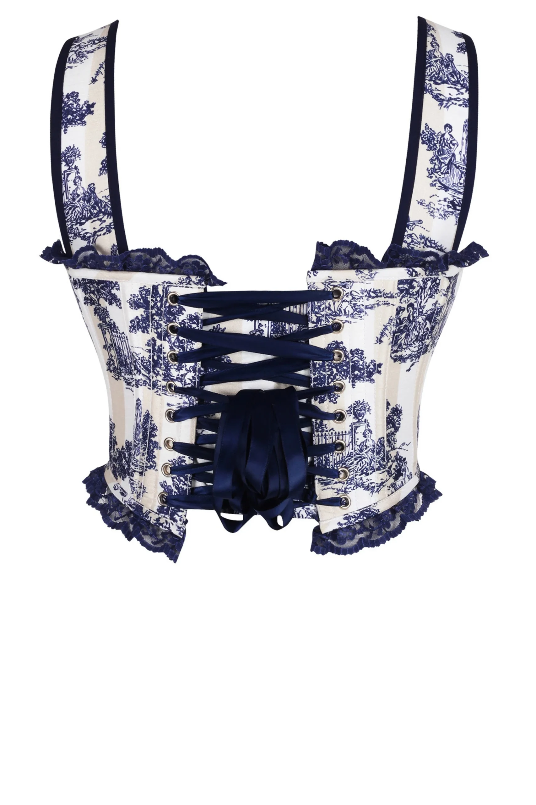 Absolutely love this bustier! The satin feels smooth and luxurious, the blue toile design is gorgeous, and it fits my shape perfectly.