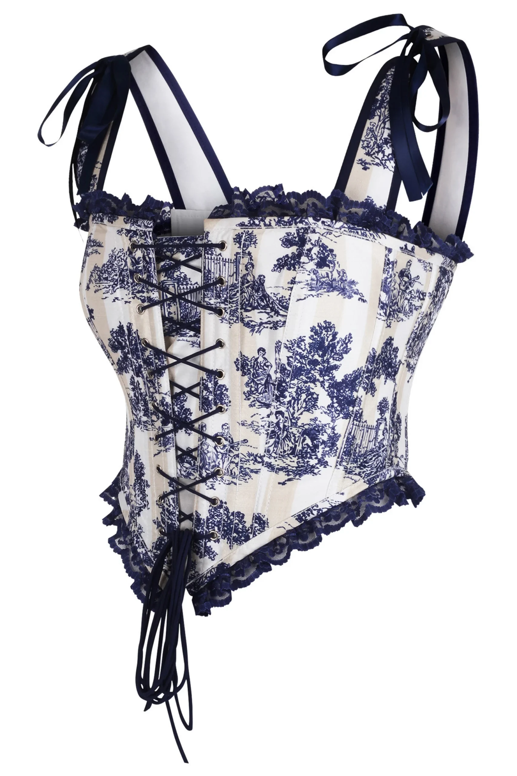 The Blue Toile Romance Satin Bustier Corset Top is a statement piece that blends elegance with charm. The white and blue satin fabric creates a timeless look that feels both classic and fresh. The delicate toile-inspired print adds romance, making it perfect for both special occasions and casual styling.