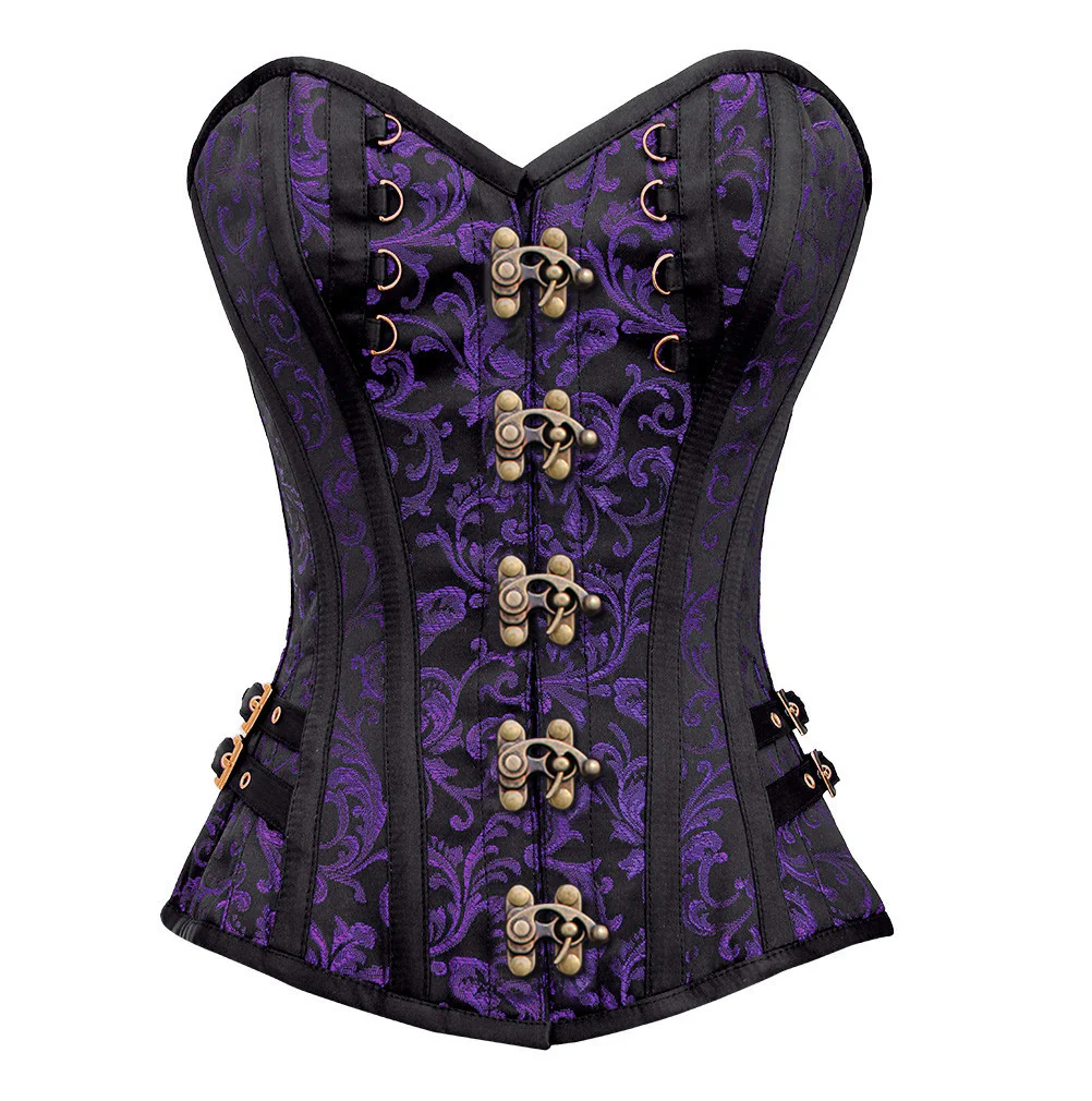 The front opening of this corset features an antique clasp design. The clasp adds vintage beauty and makes the corset easy to wear and remove. It keeps the front neat and stylish, matching perfectly with the gothic brocade look.