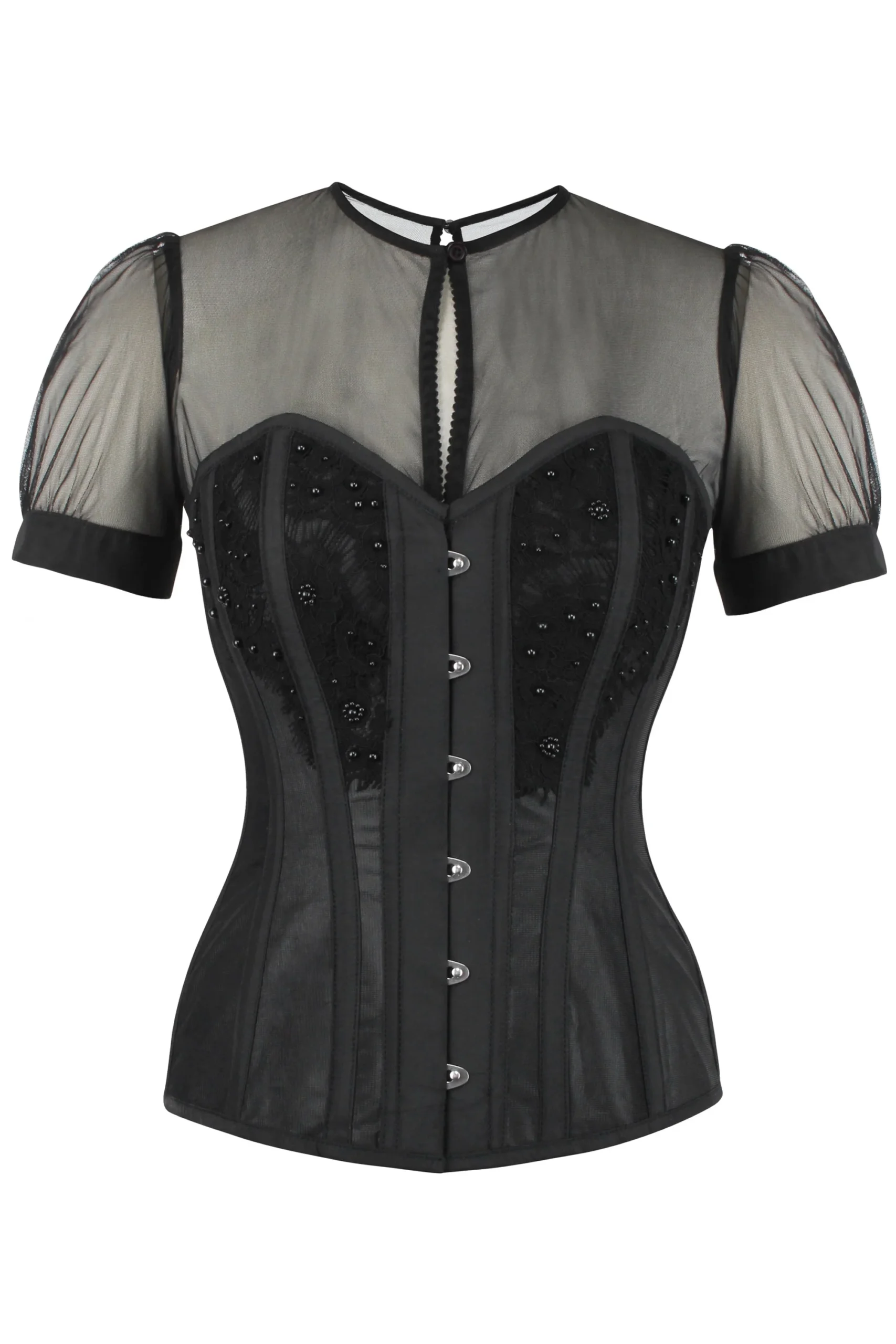 • Sleek black overbust corset with semi-sheer mesh sleeves for a gothic, edgy look.