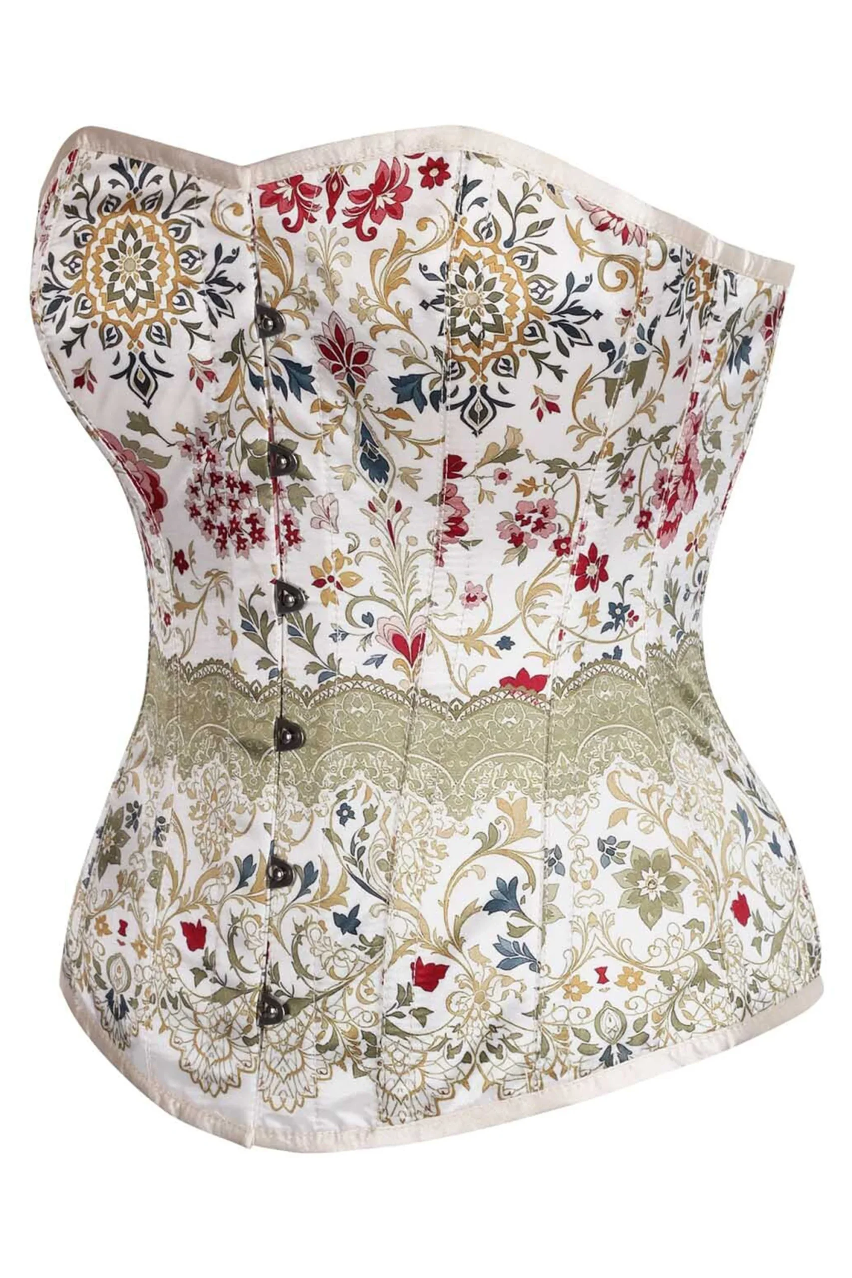 The Overbust Corset Vintage Floral Tapestry Elegance is a piece that brings classic style into modern fashion. The golden base with red and blue floral details creates a tapestry-inspired design that feels rich and regal. It is the kind of corset that makes you stand out at any occasion.