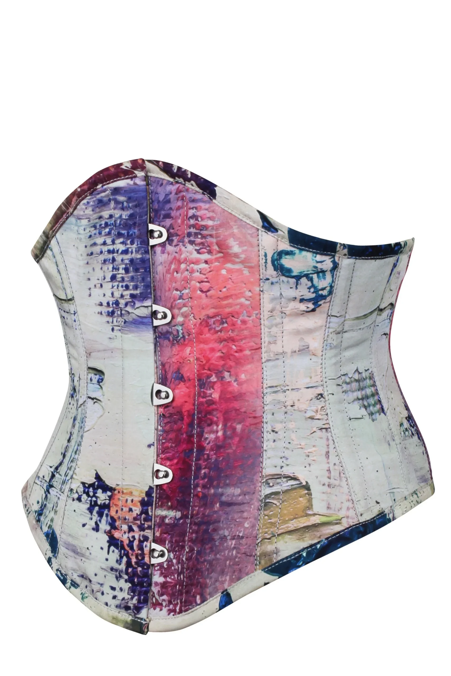 The Vibrant Purple and Cream Snake Print Waspie Corset brings together animal-inspired art and waist training strength. It blends rich shades of purple, cream, and soft pink in a snake-inspired pattern that feels both wild and elegant. The waspie style focuses on the waist, giving your outfit a bold edge without covering too much. It is a modern waist taming corset that adds personality to every look.