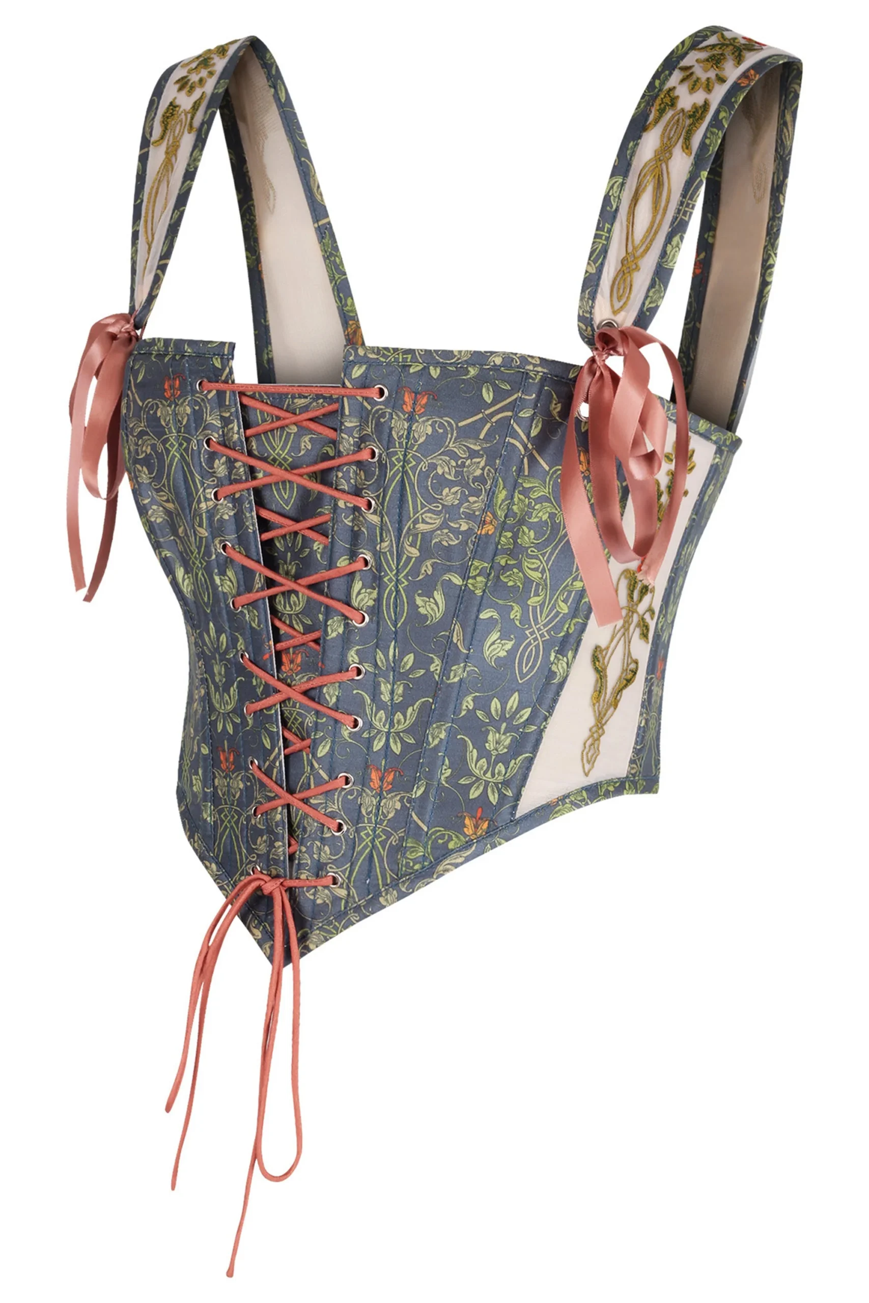 • Soft dusky blue corset with a romantic floral tapestry design.